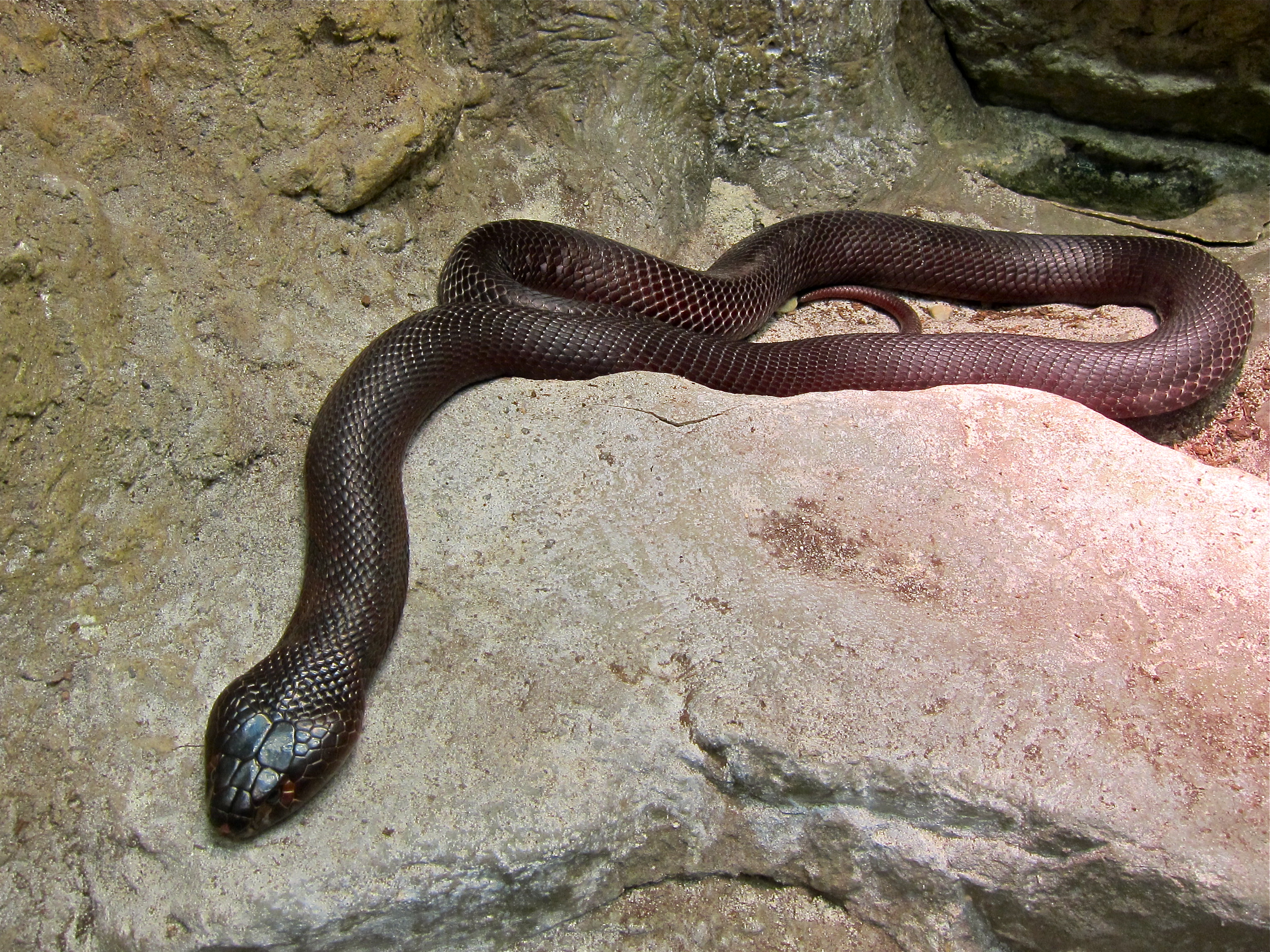 Red Spitting Cobra Naja pallida Elapidae Distribution: Eastern Africa Habitat: Primarily inhabits dry savanna and semi-desert area. Commonly found in oases in desert where it hunts. Appearance: Maximum length of 120 cm (4 feet). Color of this species has great variation from red, deep orange, pale red, pinkish and light brown. Red Spitting Cobras found in Northern Africa have duller color while others are much brighter. The hood of the Red Spitting Cobra is narrow compared with the Indian Cobra and the Cape Cobra. It also has a small round head and a pair of rather large eyes. Diet: Frogs, rodents and birds. Remarks: The snake squeezes muscles around its venom gland forcing a small jet of toxic liquid through a small hole in the front of the fangs with great accuracy at the eyes of a possible predator capable of blinding or at least causing extreme pain.
