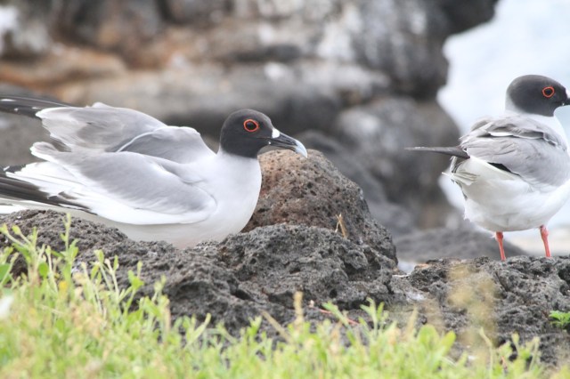 Appearance: Gulls are medium-sized to largish seabirds with long, pointed wings and longish, rather stout, hook-tipped bills, usually with a marked gonydeal angle. Their legs are longish and their feet webbed. C. furcatus is unmistakable; the only common whitish gull with a distinctive forked tail. Adult: Upper parts and neck grey; under parts white. In breeding plumage has dark grey head, large eye with red eye-ring, and black bill with pale base and tip. 51 – 58 cm (20 – 22.8 in).