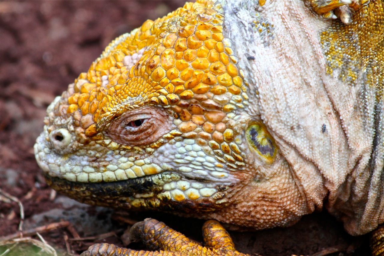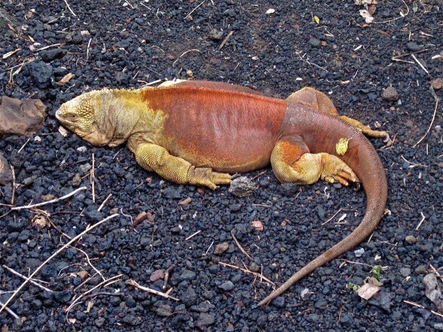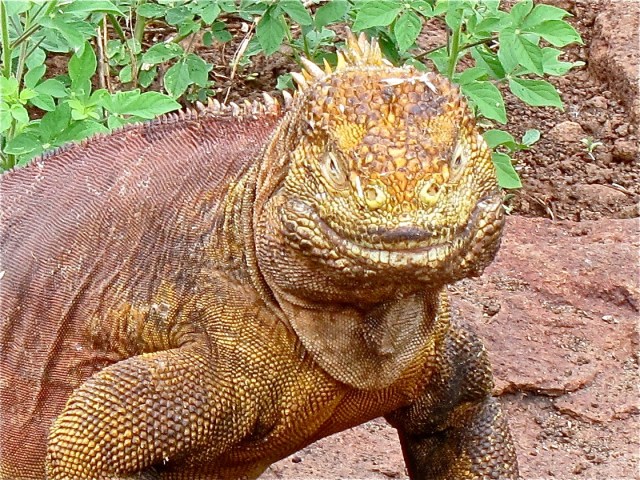 APPEARANCE: Iguanas have distinctive eyelids, external eardrums, dewlaps (throat pouches), each limb has 5 toes with sharp claws allowing them to climb. Charles Darwin described the Galapagos Land Iguana as “ugly animals, of a yellowish orange beneath, and of a brownish-red color above: from their low facial angle they have a singularly stupid appearance”.