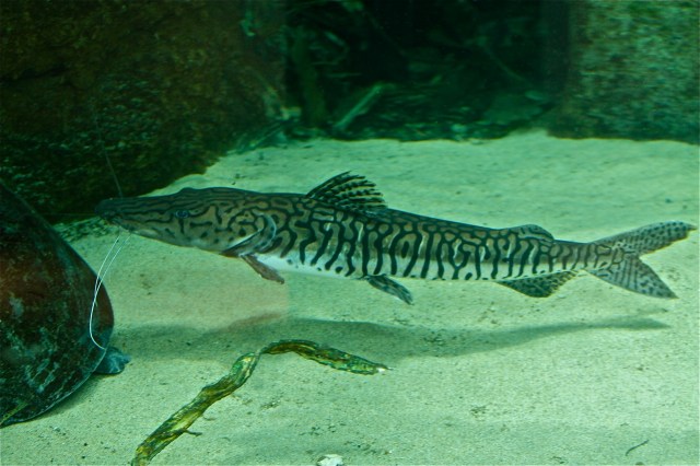APPEARANCE: Elongated, streamlined body with long snout; large mouth with three pairs of long barbels. Black spots and stripes on body and fins in irregular pattern; the pattern is banded, thus the common name. Usually silver to brown above; white to silver below. Can grow to 90 cm or more in captivity.