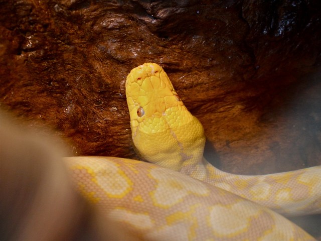 APPEARANCE: Normally colored reticulated pythons have several pigments: melanin (blacks), and xanthins (yellows) amongst other more subtle colors. Lemondrop is a “lavender albino” which is the same thing as a “tyrosinase positive albino” (t-positive) which have the inability to complete the synthesis of melanin but can produce other melanin related pigments such as various shades of brown, grey and red resulting the “lavender” color. A “normal albino” (t-negative) reticulated python is yellow and white with pink/red eyes. Melanin and other melanin pigments areas are pure white but non-melanin pigments are present giving alternate colors (xanthines produce yellows). To make matters more complicated different albino snakes may have mutations giving them additional color morphs.