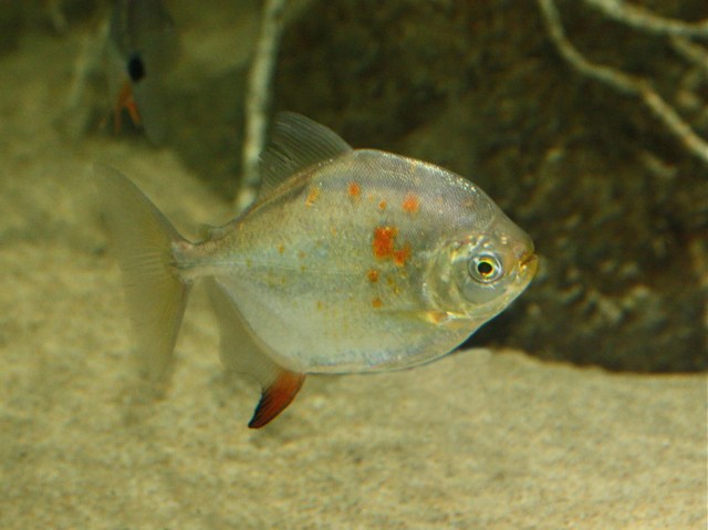 APPEARANCE: Almost circular in profile; juveniles may be spotted or striped; adults solidly silver with anal and caudal fins edged in red or orange; grows to length of 30 cm (12 in) in wild.