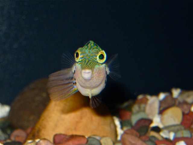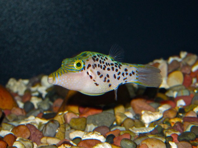 APPEARANCE: size to 7 cm. (2.75 in). Topside of face and body are yellow with blue lines; the sides and underside are white with blue spots; the sides with several clusters of brown blotches. Fins clear, except tail.