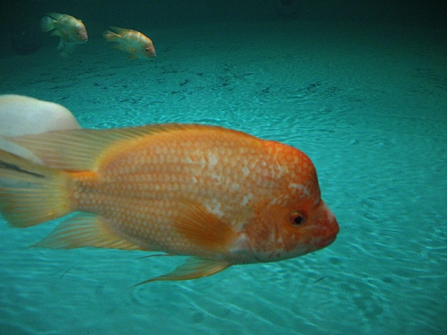 APPEARANCE: The body of the Red Devil is robust and stocky. It has a great deal of variability in its structure and coloration. Some are bright red while others are white or yellow. Males will develop an impressive nuchal hump as they grow. Length to 24 cm or approximately 10 in.