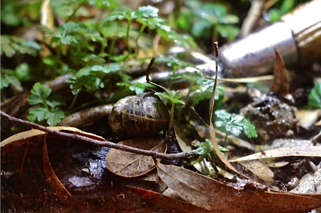 APPEARANCE: hard, thin calcareous shell 25–40 mm in diameter and 25–35 mm high, with four or five whorls. The shell is somewhat variable in color and shade but is generally dark brown or chestnut with yellow stripes, flecks, or streaks. The body is soft and slimy, brownish-grey, and is retracted entirely into the shell when the animal is inactive or threatened. The head bears four tentacles, the upper two of which have eye-like light sensors, and the lower two of which are smaller, tactile and olfactory sensory structures.