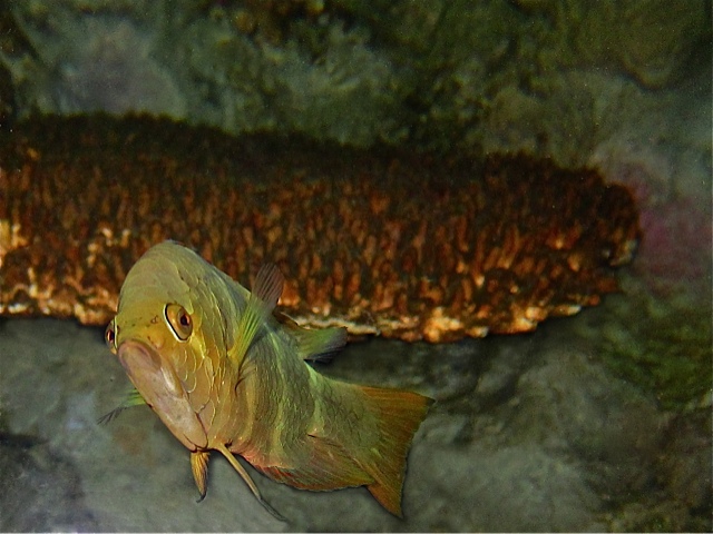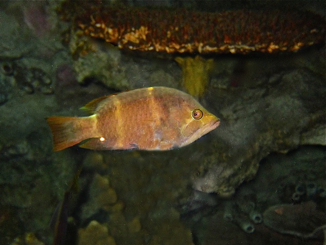 Small juveniles are brown with thin white bars. Color varies with age and sex, but adult color is variable, including with an all-yellow xanthic form. Terminal males are dark with a white head and a dark streak extending horizontally through the eye. Male becomes ornamented with orange and yellow over the back. Juveniles dark with fine vertical white lines. Intermediates with yellow blotches, pale tail and sometimes with black pectoral fins.