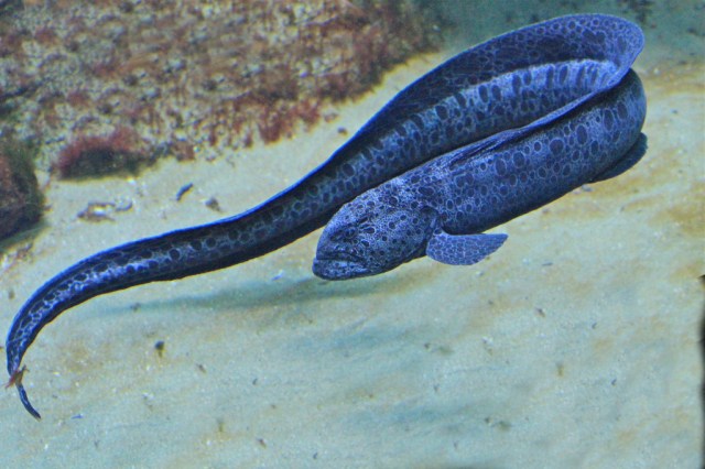 An eel-like fish (large, elongate, compressed body) with no pelvic fins. Large pectoral fins. Colored mostly gray to brown, occasionally greenish. Round dark spots with pale rings on body and fins. Length to 2.4 m (7.2 ft). Weight to 18 kg 41 lb. Not a true eel of the Order Anguilliformes.