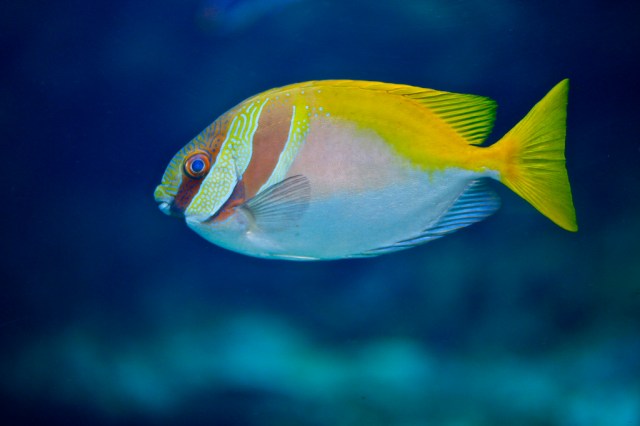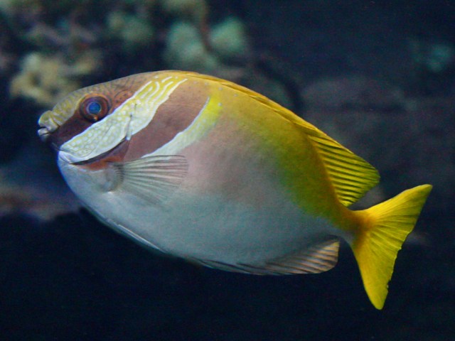 GENERAL CHARACTERISTICS: Length to 25 cm (9.5 in). Light blue body above, silvery below with intricate patterns of thin blue and yellow lines; pair of brown bars on head and forebody; yellow tail.