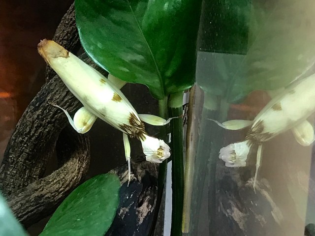 REPRODUCTION: During the 1st instar hatchlings, orchid mantises resemble ants with black bodies and red legs. Only after they have shed their skin one time (2nd instar), they become white. After a few more sheds, they will get their final color, white or pink, males with a brownish-purple “necklace”, and females with a green necklace.