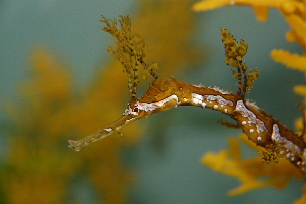GENERAL CHARACTERISTICS: Ribboned Pipefish have elongate scaleless bodies with bony knobs above the eyes and spines on body with a series of bony rings. The body color consists of shades of brown, green and yellow; The snout is tube like with no jaw and a terminal mouth. H. taeniophorus has a single dorsal fin, and its head and body are adorned with leafy appendages. They possess a prehensile tail that is used to attach to seagrass while searching for nearby prey.