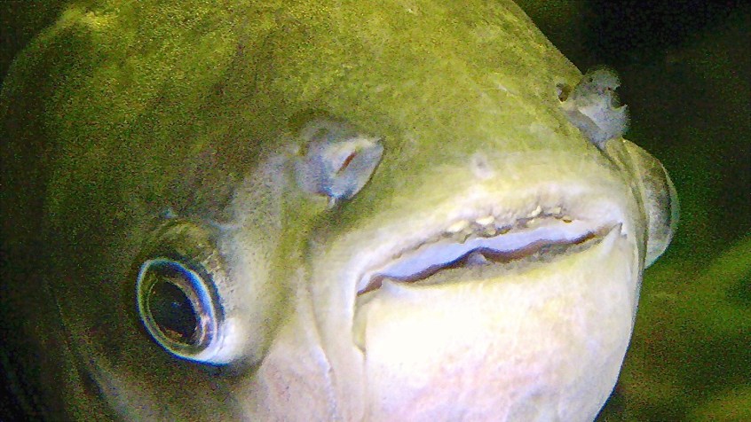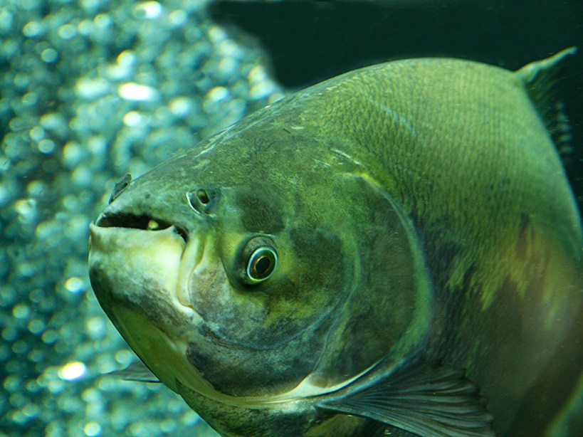 DIET IN THE WILD: Pacu teeth in front are molars for chewing, NOT ripping. Good for eating fruits, greens and grain during seasonal flooding. Also feeds on zooplankton, insects, snails and decaying plants