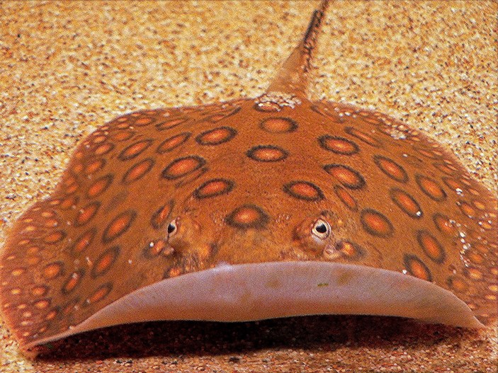 GENERAL CHARACTERISTICS: Orange-spot Stingrays have an oval disc, with a greyish-brown upper surface patterned with distinct yellow-orange spots, and a white underside. Like most rays, flat teeth are used to grip and crush prey that is sucked into the ventral mouth. Note periscoping eyes which protrude from sand when buried. Olfaction is a major and well-developed means of perception for these stingrays; their olfactory organs are situated in laterally placed cartilaginous capsules on the top of the head. The spine on the tip of the tail is capable of delivering a painful sting. Rays have an accessory respiratory opening, the Spiracle which is an adapted gill slit which has migrated to the top of the stingray. When the stingray is resting on the bottom the spiracle allows them to breathe.