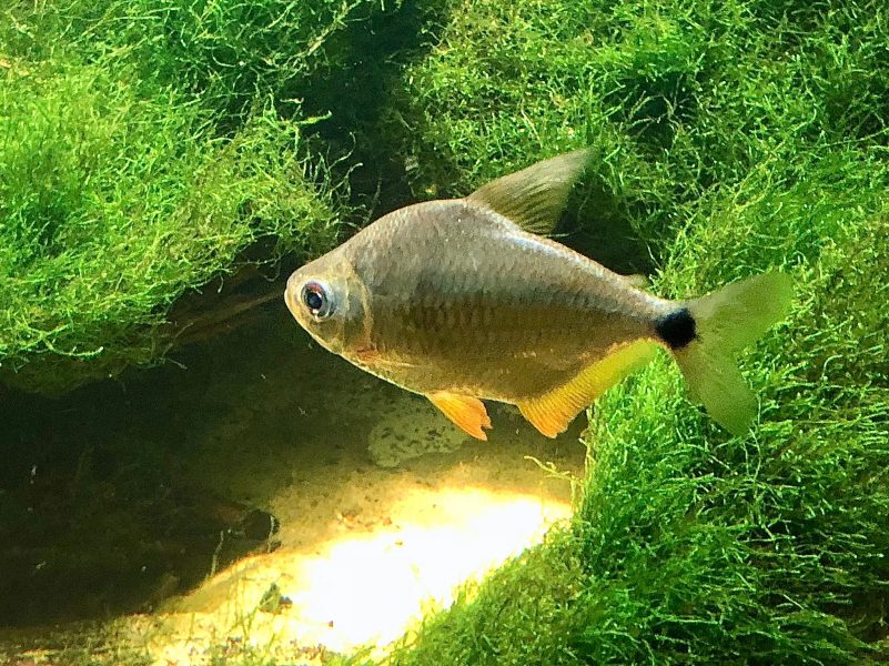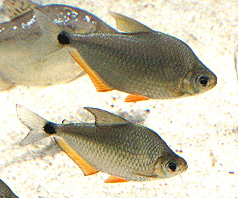 GENERAL CHARACTERISTICS: The Silver Tetra has large eyes (for murky water), and is deep bodied, laterally compressed, disc shaped, silvery color with black spot on caudal peduncle. There is a variable amount of red in the fins under the fish.