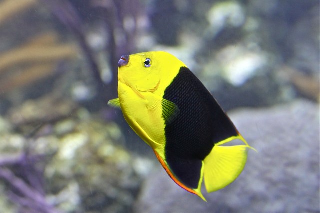 APPEARANCE: Maximum length of approximately 12 inches (35 cm). Thin and discus-shaped the front of body yellow; remaining parts of body, dorsal fin, and front of anal fin black. Caudal fin entirely yellow. Front margin of anal fin and edge of gill cover orange; bright blue on upper and lower part of iris.