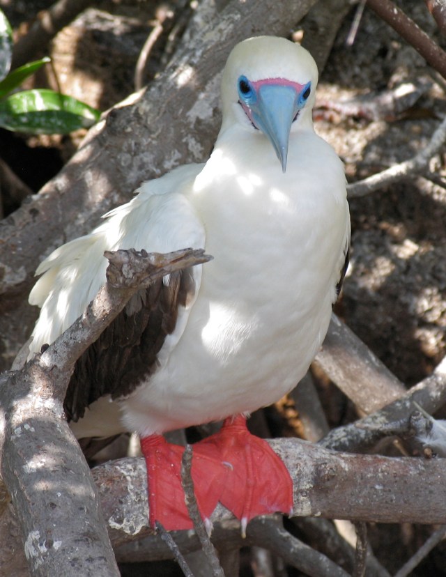 Appearance: The Red-footed Booby is the smallest of all boobies at about 70 centimetres (28 in) in length and with a wingspan of up to 1 metre (3.3 ft). It has red legs, with its bill and throat pouch colored pink and blue. Red-footed boobies appear in a variety of color morphs but all have red feet giving its name. In the white morph the plumage is mostly white (the head often tinged yellowish) and the flight feathers are black.