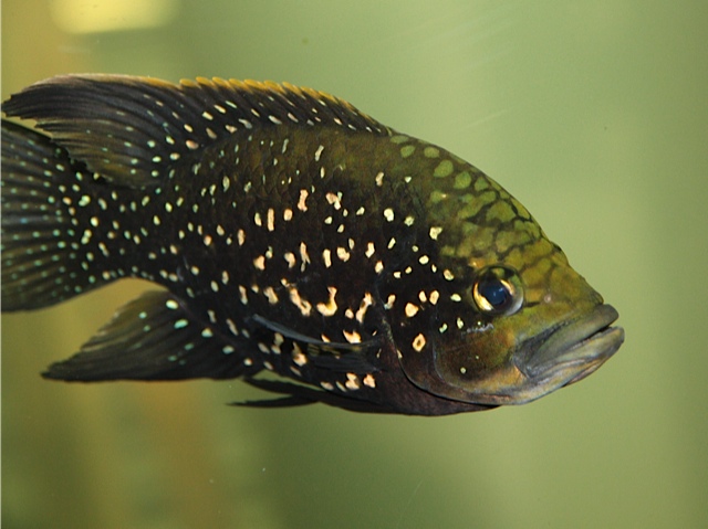 GENERAL CHARACTERISTICS: S. leucosticta has a streamlined body shape which is greenish-yellow to yellow-brown color. The head area from the mouth to the back of the gill plates are covered in numerous small whitish or iridescent bluish spots, often with a reddish background.