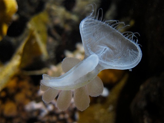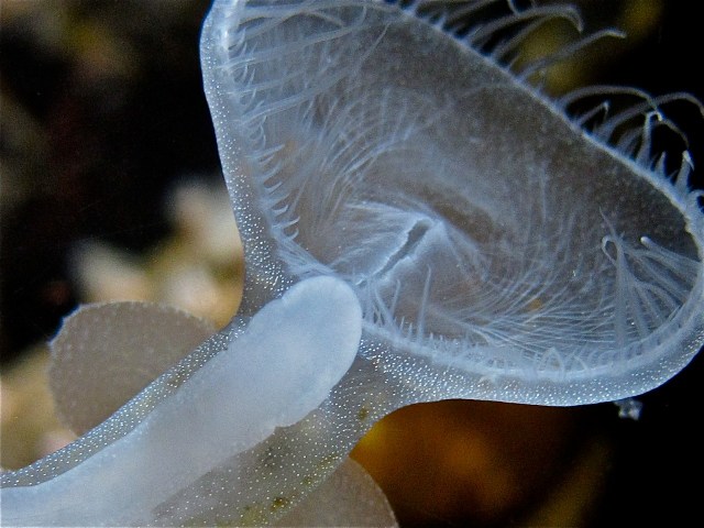 DIET: M. leonina feeds on Copepods, amphipods, and ostracods, as well as small post-larval mollusks. They firmly attache itself to a kelp blade and then sweeps its raised hood downward or to the side. When food lands on the lower surface of the hood, the melibe sweeps together the two sides of the hood, and its fringing tentacles lock in the prey. The hood contracts to force the captured food into the M. leonine’s mouth.
