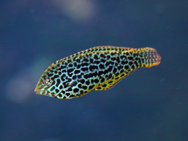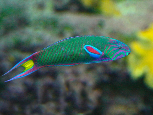 GENERAL CHARACTERISTICS: Elongated and compressed body with a Yellowish to greenish gray color and a series of narrow orange to pinkish bars edged with blue or purple along the sides A broad blue-edged dark reddish to purple area is below the eye. A chin barbel is