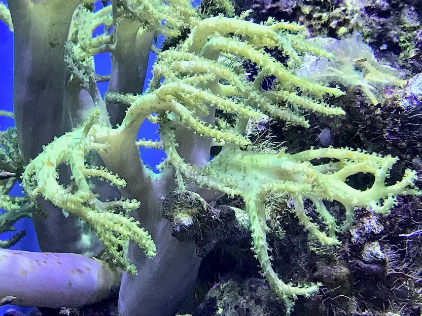GENERAL CHARACTERISTICS: Colors include purple, pink, gray, green, and yellow, but are usually brown to cream. They have stalks with tree-like branches, and from those form little branchlets. The branchlets have small autozooid (feeding) polyps which have the ability to retract fully.