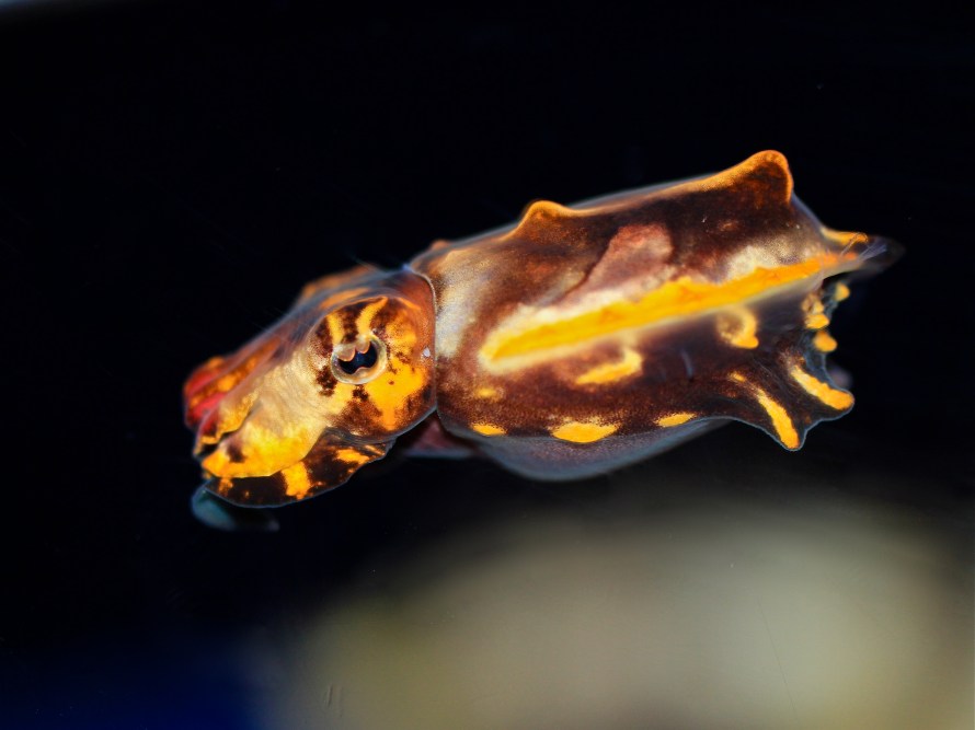 One of the most well known features of cuttles is the cuttle bone, which is often used by pet owners to provide calcium for caged birds. Cuttlefish use this multi chambered internal calcified ‘shell’ to change buoyancy by quickly filling or emptying the chambers with gas. Interestingly, while the cuttle bone of most cuttles is as long as the animal’s mantle, the diamond shaped cuttlebone of the Flamboyant is disproportionately small, thin, and only 2/3 to ¾ of the mantle length. The small size of the cuttlebone may make swimming difficult and may accounts for the Flamboyants preference to ‘walk’ along the bottom.