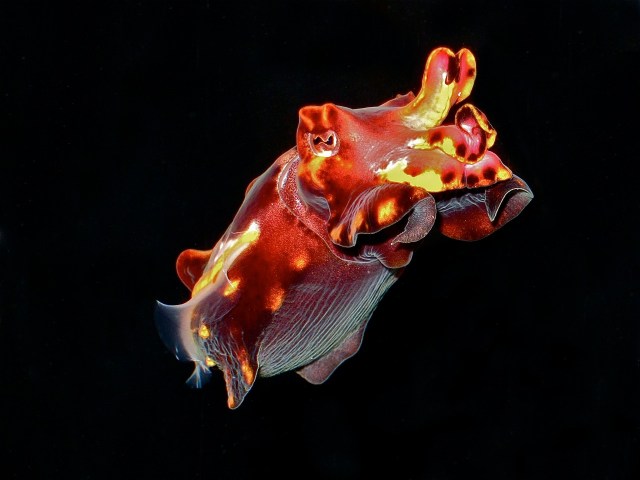 DISTRIBUTION/HABITAT: The Flamboyant Cuttlefish is found from Indonesia, the Philippines, Papua New Guinea, to Australia. Found in shallow, low-energy tropical marine waters (3 to 85 m) with mud, sand, or coral rubble