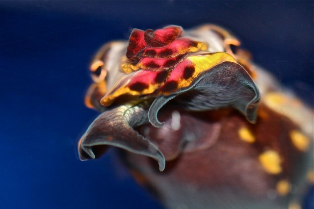 brown, and white, with yellow patches around the mantle, arms, and eyes. The arm tips often display bright red coloration to ward off would-be predators. The mantle and head are covered with flap-like, fleshy protuberances (papillae),and a V-shaped fleshy ridge runs along the underside. Yellow fins flutter along the sides to propel the animal slowly though the water or along the substrate.